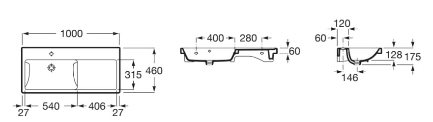 | Description | Asymmetrical Basin capacity (l): 8.8 Bowl depth (mm): 128 Bowl length (mm): 540 Bowl position: Left Bowl width (mm): 315 Fixing kit: Included Glazed base Installation type: Wall-hung Integrated shelf Material: Vitreous china Shape: Rectangular Shelf position: Right Taphole configuration: 1 taphole in the middle Trap: Not included Waste: Not included Weight (Kg): 24.5 |
