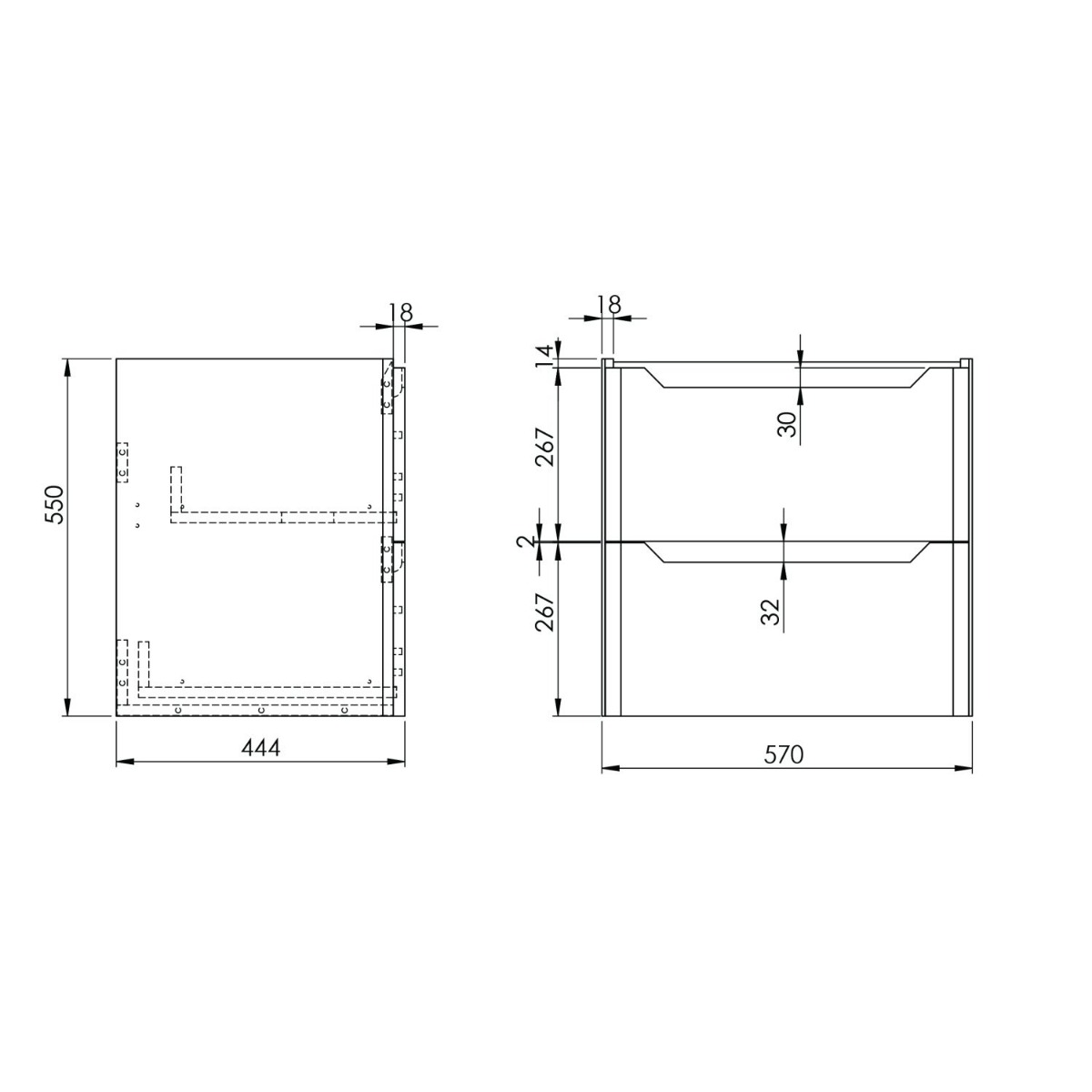 | Description | Construction Material Melamine, Installation type Wall Mounted, Supplied Fully Assembled Yes, Number Of Drawers 2, Number Of Doors 0, Soft Close Doors / Drawers Yes, Moisture resistant Yes, Internal Shelves 0, Door Opening Width (mm) N/a, Draw Opening Distance (mm) 0 Recommended Concealed Cistern 0, False Draws No, Number of False Draws 0, Can the door be swapped over to open the oppersite way N/a, Which side is the door hinge located N/a, Handle Style Recessed cut out, Product Width (mm): 570, Product Height (mm): 550, Product Depth (mm): 444 |