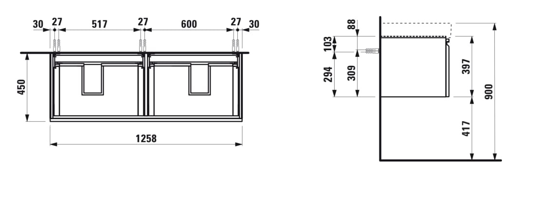 | Description | Adjustable legs Basin position: Left, Right Basin type: Vanity Doors and drawers combination: 2 drawers Furniture configuration: Drawers Installation type: Wall-hung Internal dividers Internal drawers: 2 Internal shelves: 0 Legs included: 0 |