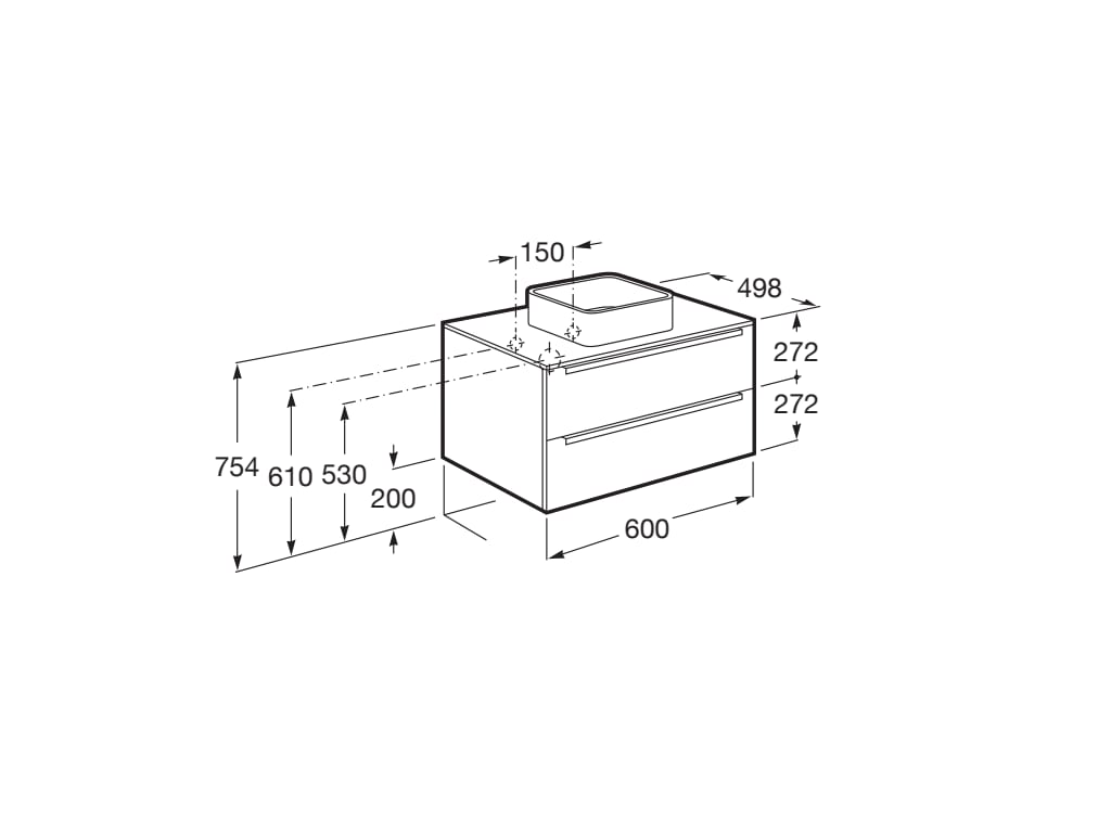 DescriptionBasin position: Central Basin type: Bowl / On countertop Doors and drawers combination: 2 drawers Furniture configuration: Drawers Installation type: Wall-hung, Wall-hung with legs Material: Chipboard Space-saving waste included Tap position: Central