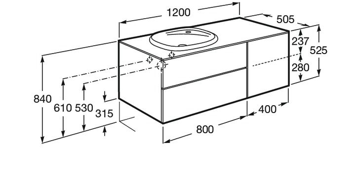 | Description | Basin position: Left Basin type: Bowl/ On countertop Closing and opening system: Push to open Doors and drawers combination: 1 door and 2 drawers Furniture configuration: Doors and drawers combination Installation type: Wall-hung Material: Chipboard Modular Tap position: On the basin |