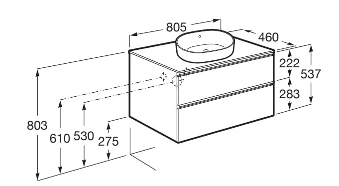 | Description | Basin position: Central Basin type: Bowl / On countertop Closing and opening system: Soft close drawers Door type: Hinged Doors and drawers combination: 2 drawers Furniture configuration: Drawers Installation type: Wall-hung, Wall-hung with legs Internal dividers Material: Chipboard Shelf material: Chipboard Tap position: Central Taphole configuration: No tapholes |
