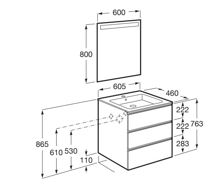 | Description | Base unit / Closing and opening system: Soft close drawers Base unit / Door type: Sliding Base unit / Doors and drawers combination: 3 drawers Base unit / Internal dividers Base unit / Structure: Drawers Basin / Integrated shelf Basin / Shelf position: On both sides Basin / Taphole configuration: 1 taphole in the middle Basin Position: Central Basin shape: Square Dimensions / Basin and base unit / Height (mm): 763 Dimensions / Basin and base unit / Length (mm): 605 Dimensions / Basin and base unit / Width (mm): 460 Dimensions / Mirror / Height (mm): 800 Dimensions / Mirror / Length (mm): 600 Installation type: Wall-hung, Wall-hung with optional legs Material / Base unit: Chipboard Material / Basin: Vitreous china Material / Mirror frame: Aluminium, Tempered glass Mirror / Ingress Protection Rating of the light: IP 44 Mirror / Light type: LED Mirror / Lighting: Integrated in the mirror Mirror / Number of lights: 1 Tap installation: On the basin Towel rail position: Left |