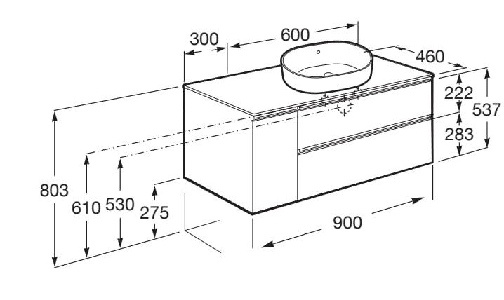 | Description | Basin position: Right Basin type: Bowl / On countertop Closing and opening system: Soft close drawers Door type: Hinged Doors and drawers combination: 1 door and 2 drawers Furniture configuration: Doors and drawers combination Installation type: Wall-hung, Wall-hung with legs Internal dividers Material: Chipboard Right hand opening Shelf material: Chipboard Tap position: Central |