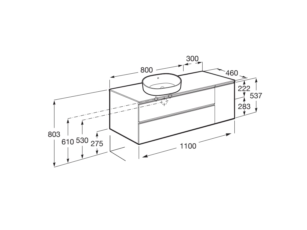 Basin position: Left Basin type: Bowl / On countertop Closing and opening system: Soft close drawers Door type: Hinged Doors and drawers combination: 1 door and 2 drawers Furniture configuration: Doors and drawers combination Installation type: Wall-hung, Wall-hung with legs Internal dividers Left hand opening Material: Chipboard Shelf material: Chipboard Tap position: Central Taphole configuration: No tapholes