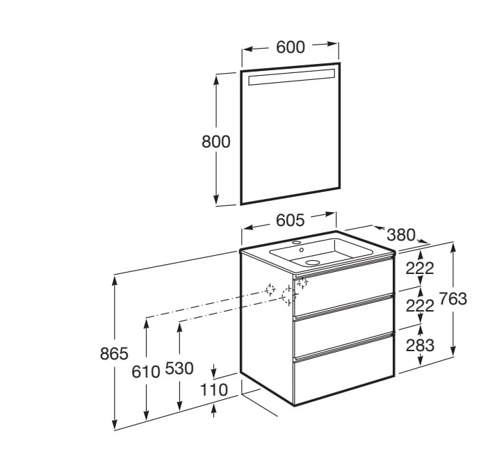 DescriptionBase unit / Closing and opening system: Soft close drawers Base unit / Door type: Sliding Base unit / Doors and drawers combination: 3 drawers Base unit / Internal dividers Base unit / Structure: Drawers Basin / Integrated shelf Basin / Shelf position: On both sides Basin / Taphole configuration: 1 taphole in the middle Basin Position: Central Basin shape: Square Dimensions / Basin and base unit / Height (mm): 759 Dimensions / Basin and base unit / Length (mm): 605 Dimensions / Basin and base unit / Width (mm): 380 Dimensions / Mirror / Height (mm): 800 Dimensions / Mirror / Length (mm): 600 Installation type: Wall-hung, Wall-hung with optional legs Material / Base unit: Chipboard Material / Basin: Vitreous china Material / Mirror frame: Aluminium, Tempered glass Mirror / Ingress Protection Rating of the light: IP 44 Mirror / Light type: LED Mirror / Lighting: Integrated in the mirror Mirror / Number of lights: 1 Tap installation: On the basin