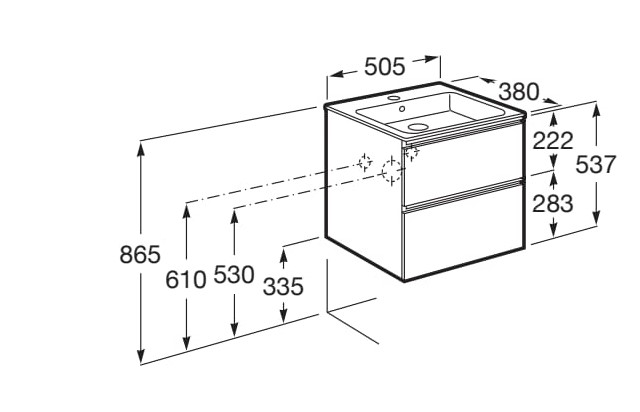 | Description | Base unit / Closing and opening system: Soft close drawers Base unit / Door type: Sliding Base unit / Doors and drawers combination: 2 drawers Base unit / Internal dividers Base unit / Structure: Drawers Basin / Integrated shelf Basin / Shelf position: On both sides Basin / Taphole configuration: 1 taphole in the middle Basin Position: Central Basin shape: Square Dimensions / Basin and base unit / Height (mm): 537 Dimensions / Basin and base unit / Length (mm): 505 Dimensions / Basin and base unit / Width (mm): 380 Installation type: Wall-hung, Wall-hung with optional legs Material / Base unit: Chipboard Material / Basin: Vitreous china Tap installation: On the basin Towel rail position: Left |