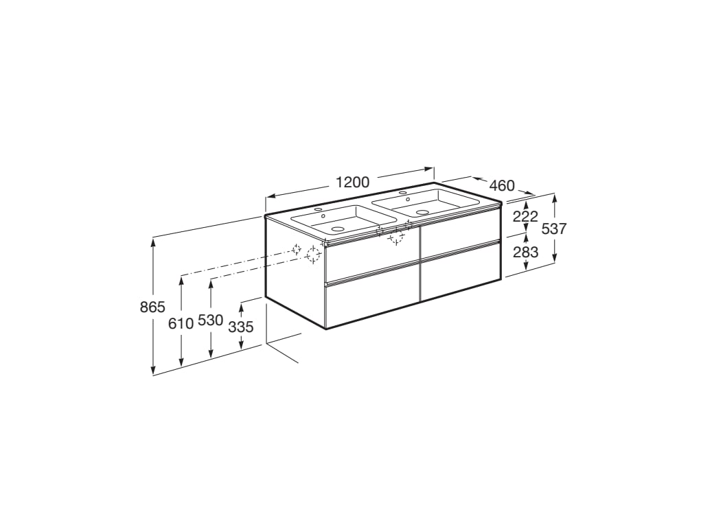 | Description | Base unit / Closing and opening system: Soft close drawers Base unit / Door type: Sliding Base unit / Doors and drawers combination: 4 drawers Base unit / Internal dividers Base unit / Structure: Drawers Basin / Double bowl Basin / Integrated shelf Basin / Shelf position: On both sides Basin / Taphole configuration: 1 taphole in the middle Basin shape: Square Dimensions / Basin and base unit / Height (mm): 537 Dimensions / Basin and base unit / Length (mm): 1200 Dimensions / Basin and base unit / Width (mm): 460 Installation type: Wall-hung, Wall-hung with optional legs Material / Base unit: Chipboard Material / Basin: Vitreous china Tap installation: On the basin Towel rail position: Left |