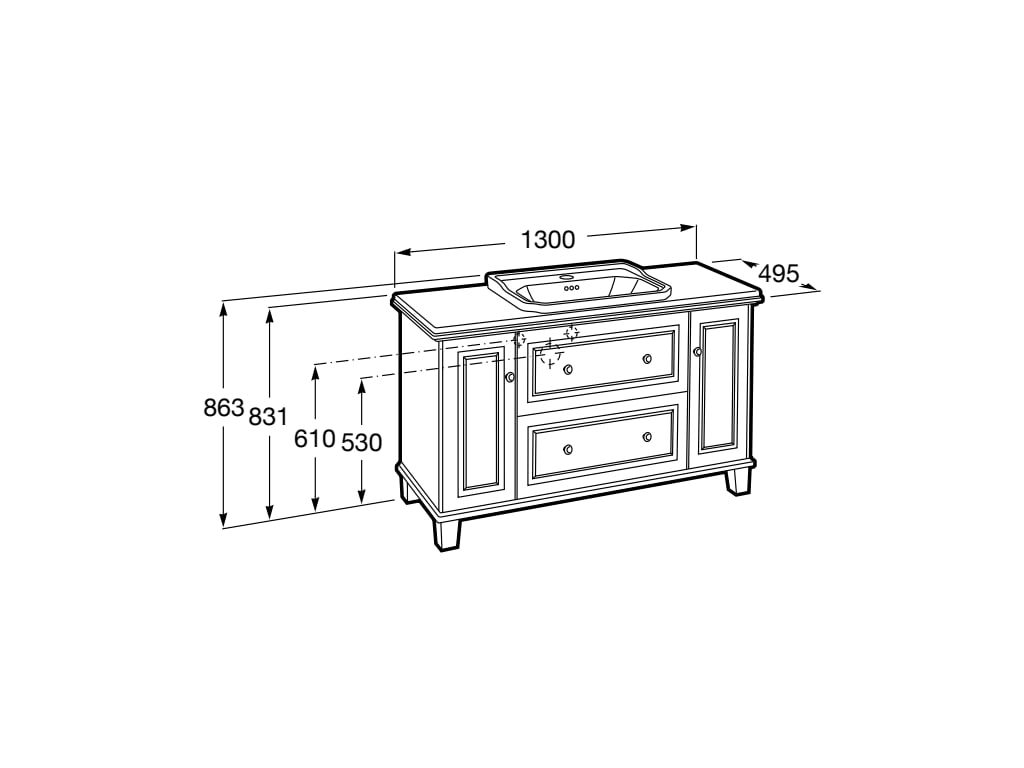 | Description | Basin position: Central Basin type: Drop-in / In countertop Closing and opening system: Soft and self close drawers Door type: Hinged Doors and drawers combination: 2 doors and 2 drawers Furniture configuration: Doors and drawers combination Installation type: Floor-standing Left hand opening Leg material/finish: Wood Right hand opening Shelf material: Natural wood Tap position: On the basin Taphole configuration: 1 Taphole in the middle |