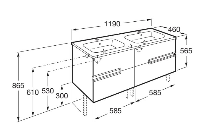 Base unit / Closing and opening system: Soft close drawers Base unit / Doors and drawers combination: 4 drawers Base unit / Structure: Drawers Basin / Double bowl Basin / Integrated shelf Basin / Shelf position: On both sides Basin / Taphole configuration: 1 Taphole, 1 Taphole Basin shape: Square Installation type: Wall-hung, Wall-hung with optional legs Material / Basin: Vitreous china Tap installation: On the basin Towel rail position: Left, Right