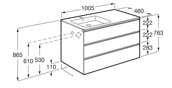 | Description | Base unit / Closing and opening system: Soft close drawers Base unit / Door type: Sliding Base unit / Doors and drawers combination: 3 drawers Base unit / Internal dividers Base unit / Structure: Drawers Basin / Integrated shelf Basin / Shelf position: Left Basin / Taphole configuration: 1 taphole in the middle Basin Position: Left Basin shape: Square Dimensions / Basin and base unit / Height (mm): 763 Dimensions / Basin and base unit / Length (mm): 1005 Dimensions / Basin and base unit / Width (mm): 460 Installation type: Wall-hung, Wall-hung with optional legs Material / Base unit: Chipboard Material / Basin: Vitreous china Tap installation: On the basin Towel rail position: Left |