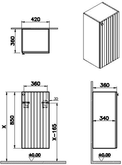 | Description | The product has a height of 95 cm, a width of 40 cm, and a depth of 35 cm. The front has a thermoform finish and the body is made of MDF. The door hinge is positioned on the right and it has a black button handle grip. The product comes with a 2-year guarantee, is available in a Matt graphite color, and was designed by the VitrA Design Team. It is meant to be mounted on a wall. |