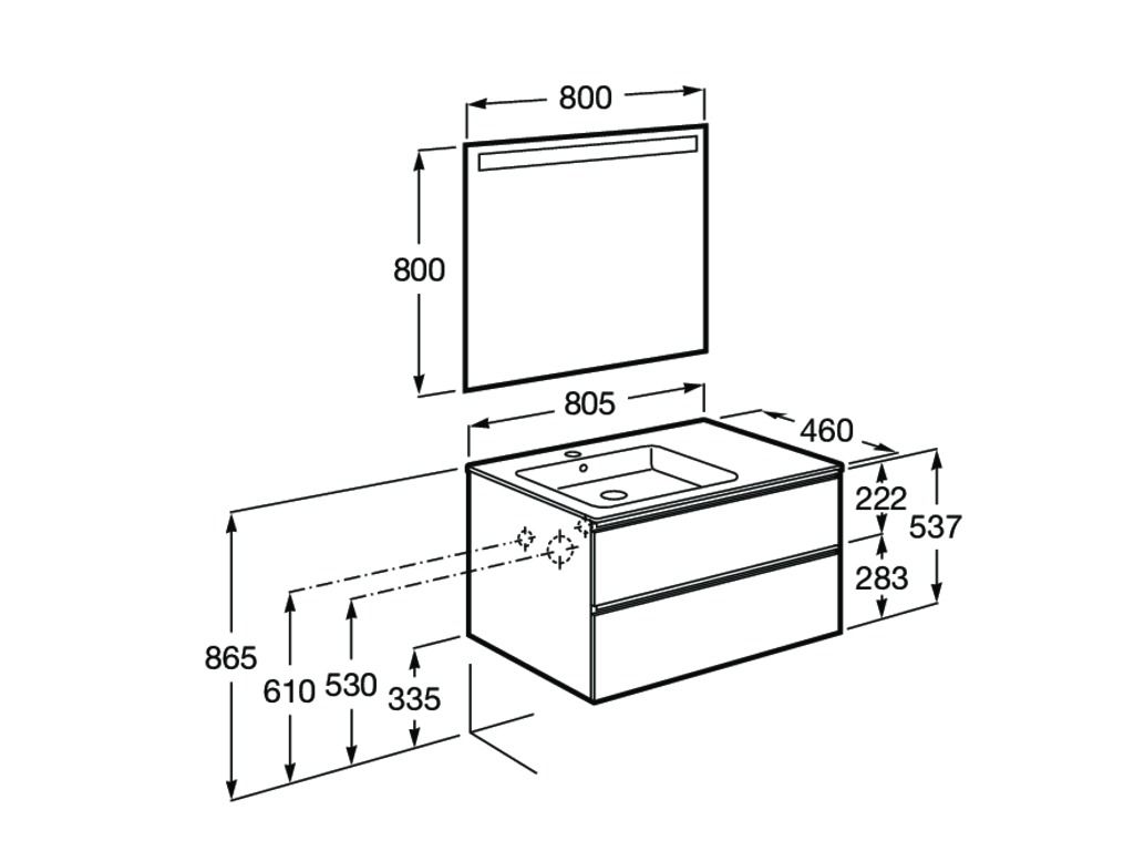 | Description | Base unit / Door type: Sliding Base unit / Doors and drawers combination: 2 drawers Base unit / Internal dividers Base unit / Structure: Drawers Basin / Integrated shelf Basin / Shelf position: Left Basin / Taphole configuration: 1 taphole in the middle Basin Position: Left Dimensions / Basin and base unit / Height (mm): 537 Dimensions / Basin and base unit / Length (mm): 805 Dimensions / Basin and base unit / Width (mm): 460 Dimensions / Mirror / Height (mm): 800 Dimensions / Mirror / Length (mm): 800 Installation type: Wall-hung, Wall-hung with optional legs Material / Base unit: Chipboard Material / Basin: Vitreous china Material / Mirror frame: Aluminium, Tempered glass Mirror / Ingress Protection Rating of the light: IP 44 Mirror / Light type: LED Mirror / Lighting: Integrated in the mirror Mirror / Number of lights: 1 |