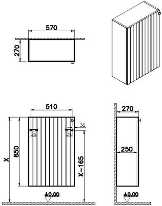 | Description | The product has a height of 85 cm, a width of 55 cm, and a depth of 25 cm. It comes with a 2-year guarantee and has a body made of MDF and a front with a thermoform finish. The door hinge is positioned on the left, and it is meant to be mounted on a wall. The product is available in a Matt Light Grey color, was designed by the VitrA Design Team, and has a black button handle grip. |