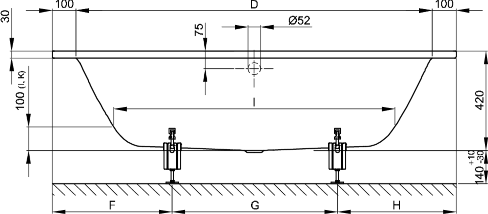Dimensions: 1800 x 800 x 420 / 1285 mm Weight: 48 kg Capacity*: 170 l Edge height: 30 mm Corner radius: 10 mm Drain Diameter: 52 mm Lying Dimension: 1285 mm Scope of delivery: Including noise-reducing sound-dampening pads. Technical advice: For professional installation we recommend the use of the original bath feet B23-1500. If the bath is to be fitted under a panel, please contact us for individual cut-out details.