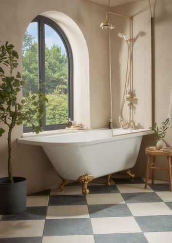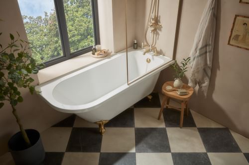 • Ideal for smaller bathrooms, this traditional bath design fits neatly into corner spaces- allowing for an overhead shower system for convenience and style. Customise and coordinate with a wide selection of hardware and brassware.