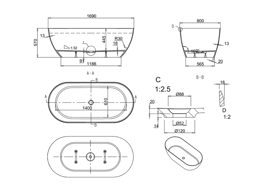 | Description | Supplied with a template to define the overflow hole on the bath. No overflow When using underfloor heating please take care not to put the heating pipes/matt underneath the bath area. The bath should not sit on a heated floor. Not suitable for rim-mounted taps |