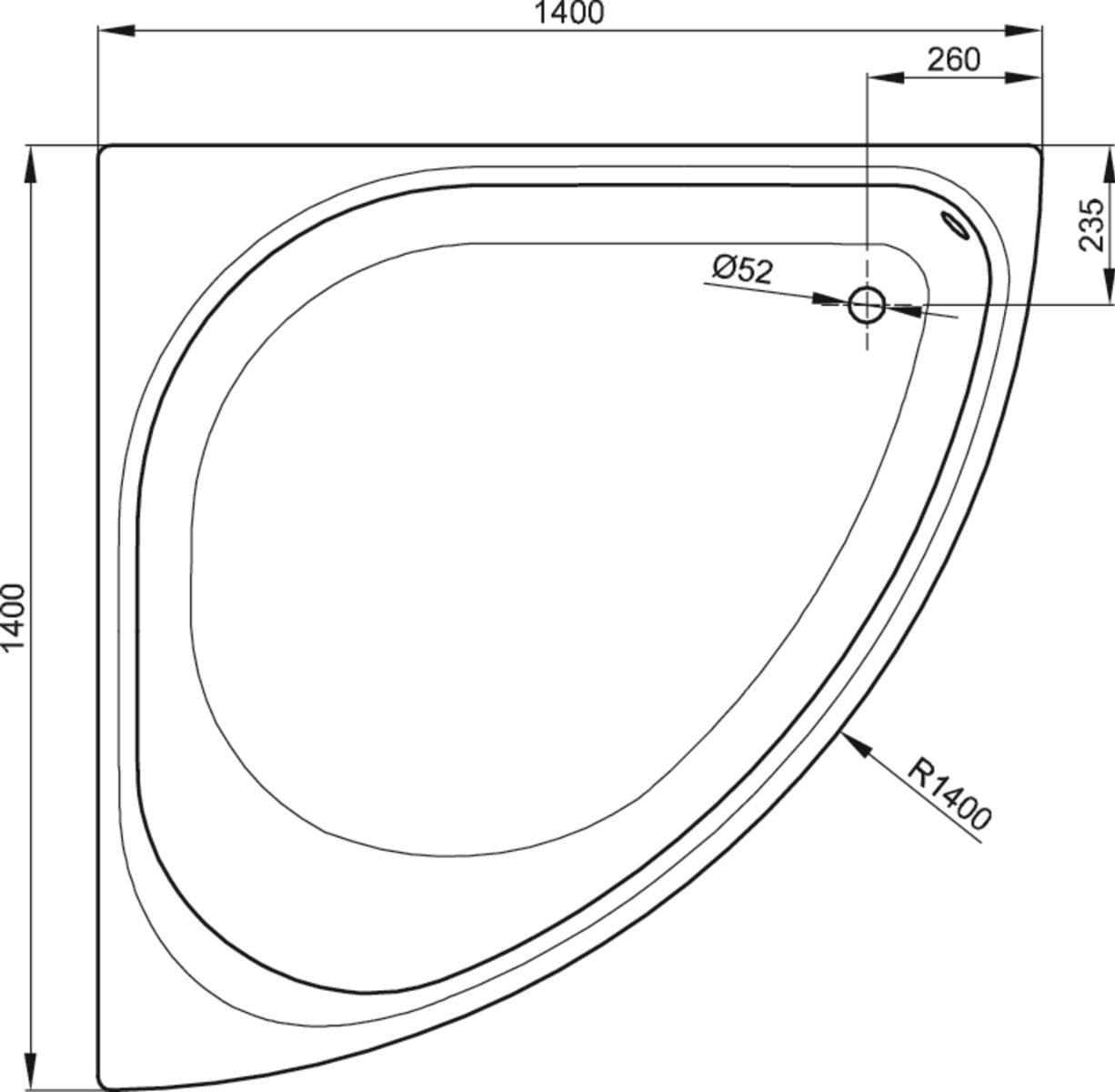 Dimensions: 1400 x 1400 x 450 / 1426 mm Weight: 58,8 kg Capacity*: 267 l Edge height: 50 mm Drain Diameter: 52 mm Lying Dimension: 1426 mm Scope of delivery: Including noise-reducing sound-dampening pads. Technical advice: For professional installation we recommend the use of the original bath feet B50-0015.