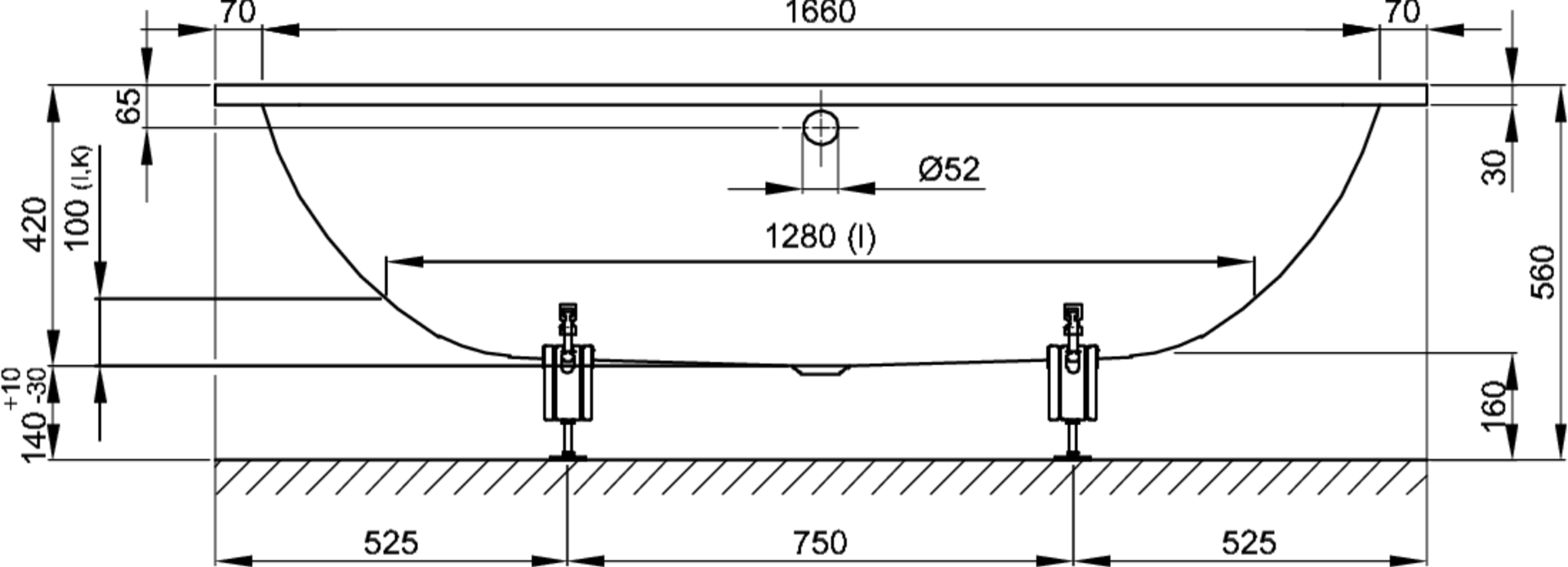 Dimensions: 1800 x 800 x 420 / 1280 mm Weight: 50,1 kg Capacity*: 143 l Edge height: 30 mm Corner radius: 10 mm Drain Diameter: 52 mm Lying Dimension: 1280 mm Scope of delivery: Including noise-reducing sound-dampening pads. Technical advice: If an overflow filling waste is being used, water may hit the internal ledge. For professional installation we recommend the use of the original bath feet B23-1500. If the bath is to be fitted under a panel, please contact us for individual cut-out details.