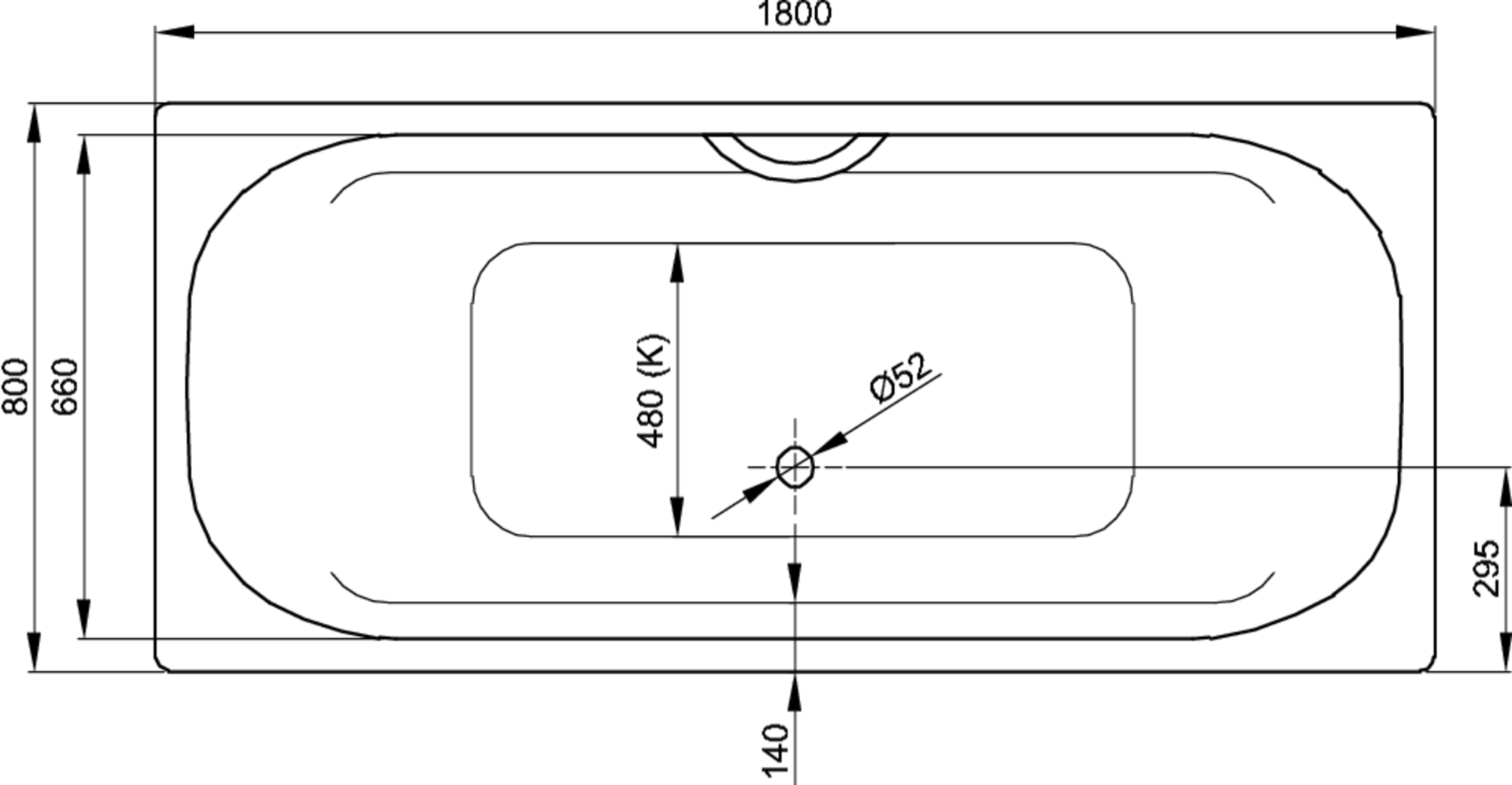 Dimensions: 1800 x 800 x 420 / 1280 mm Weight: 50,1 kg Capacity*: 143 l Edge height: 30 mm Corner radius: 10 mm Drain Diameter: 52 mm Lying Dimension: 1280 mm Scope of delivery: Including noise-reducing sound-dampening pads. Technical advice: If an overflow filling waste is being used, water may hit the internal ledge. For professional installation we recommend the use of the original bath feet B23-1500. If the bath is to be fitted under a panel, please contact us for individual cut-out details.