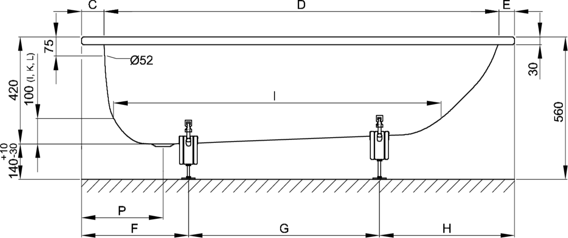 | Description | Dimensions: 1700 x 750 x 450 / 1160 mm Weight: 47,1 kg Capacity*: 150 l Edge height: 30 mm Corner radius: 10 mm Drain Diameter: 52 mm Lying Dimension: 1160 mm Scope of delivery: Including noise-reducing sound-dampening pads. Technical advice: Tapholes can be placed on the overflow rim and on both short side rims. For professional installation we recommend the use of the original bath feet B23-1500.