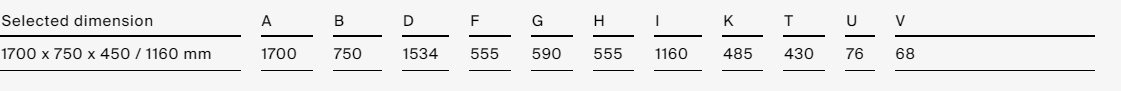 | Dimensions: | 1700 x 750 x 450 / 1160 mm |