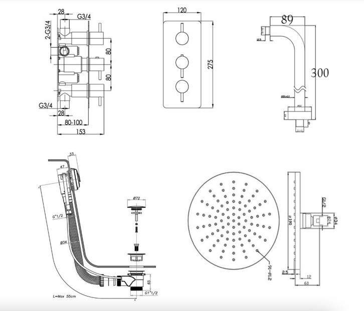 | Description | 15690 – Thermostatic concealed 2 outlet shower valve Specification