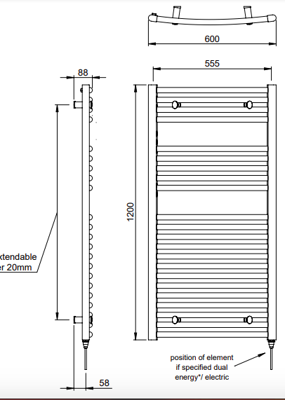 | Description | Chorus | wall mounted MD002It’s all in the detail! Capped off ends with a hidden air vent create a smooth and modern finish on this towel warmer. Adjustable brackets through the crossbars also offer freedom and ease of installation. Offering a copious amount of rails for optimum efficiency, this contemporary rail is a modern example of proficient design… the curved version of our staple MD001. |