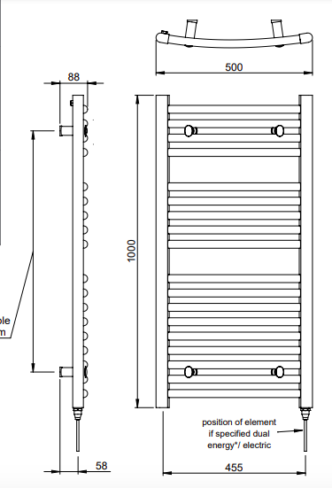 | Description | Chorus | wall mounted MD002It’s all in the detail! Capped off ends with a hidden air vent create a smooth and modern finish on this towel warmer. Adjustable brackets through the crossbars also offer freedom and ease of installation. Offering a copious amount of rails for optimum efficiency, this contemporary rail is a modern example of proficient design… the curved version of our staple MD001. |