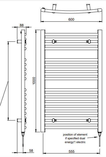| Description | Chorus | wall mounted MD002It’s all in the detail! Capped off ends with a hidden air vent create a smooth and modern finish on this towel warmer. Adjustable brackets through the crossbars also offer freedom and ease of installation. Offering a copious amount of rails for optimum efficiency, this contemporary rail is a modern example of proficient design… the curved version of our staple MD001. |