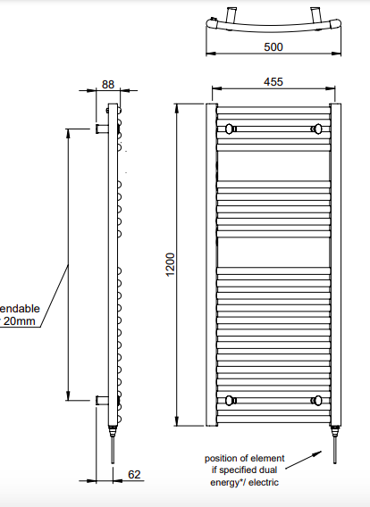 | Description | Chorus | wall mounted MD002It’s all in the detail! Capped off ends with a hidden air vent create a smooth and modern finish on this towel warmer. Adjustable brackets through the crossbars also offer freedom and ease of installation. Offering a copious amount of rails for optimum efficiency, this contemporary rail is a modern example of proficient design… the curved version of our staple MD001. |