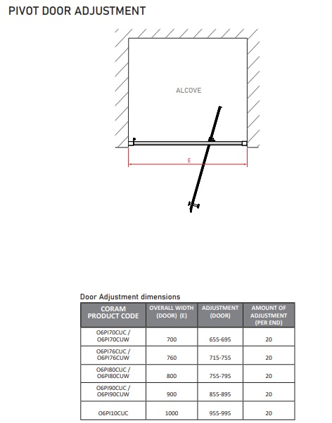 | Description | A contemporary semi-frameless pivot door design, which is ideal for smaller spaces. Featuring smooth rise and fall hinges, ultra-clear seals and stay clean glass as standard. Minimal semi-frameless design, 1900mm high, 20mm adjustment per profile, Ultra-clear soft seals with UV resistant treatment applied to reduce discolouration over time, Level and Lock™ Screwless adjustment, CE tested and compliant to BS EN 14428, Fully reversible design, Seamless profiles and fixings for a minimal look and easy cleaning, Pre-assembled for Quick Installation Please note: Installation of a Side Panel with an Optima 6 door will reduce the door adjustment size by 20 mm. See door technical data sheet for full details. |