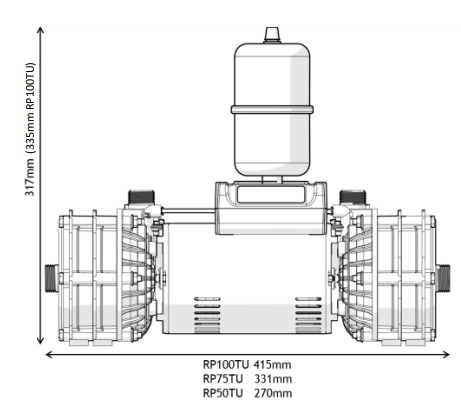 | Description | RP75TU is a 2.2 bar pressure, twin ended, universal (negative head) centrifugal pump. The RP75TU is part of the Right Pump range, these pumps use centrifugal force to boost water pressure and flow making them quiet and powerful. Increase the hot and cold water pressure with an RP75TU. RP75TU is suitable for positive and negative head, gravity fed systems. This product replaced the ESP75.Warranty 3 years, WRAS approval 1810090, dBA 50.2, Pump Type Centrifugal, Mechanical seal Nitrile/PTFE/Ceramic, Anti-vibration feet Yes, Inlet Isolator(s) Yes, Flexible hoses 4, Pressure @ 16lpm (8lpm for singles) 1.9 Bar, Bar Pressure @ 8lpm(4lpm for singles) 2.1 Bar, Pressure @ Closed Head 2.2 Bar, Maximum Water Temperature 65°C, Pressure Vessel Air Pre- Charge 18 psi, Pump connections 3/4”BSP, Connections (UK) 3/4” Female x 15mm Push-Fit x 280mm long, Type A.C Induction Motor, Duty rating Continuously Rated, Power Supply 230v, Current (full load) 2.7 Amps, Power consumption 630 Watts , Fuse Rating 5 Amps, Power cable (pre-wired) 1.5 Meters, Enclosure Protection (IP Rating) IPX3 |