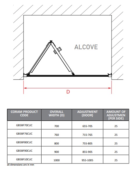 | Description | Designed for locations where space is restricted, with an inward folding door to ensure easy access. 1800mm high, High polished chrome finish, 25mm adjustment per profile, Toughened Safety glass EN 12150, Chrome cover and profile caps, Ultra-clear soft seals, Reversible design, CE tested and compliant to BS EN 14428 |