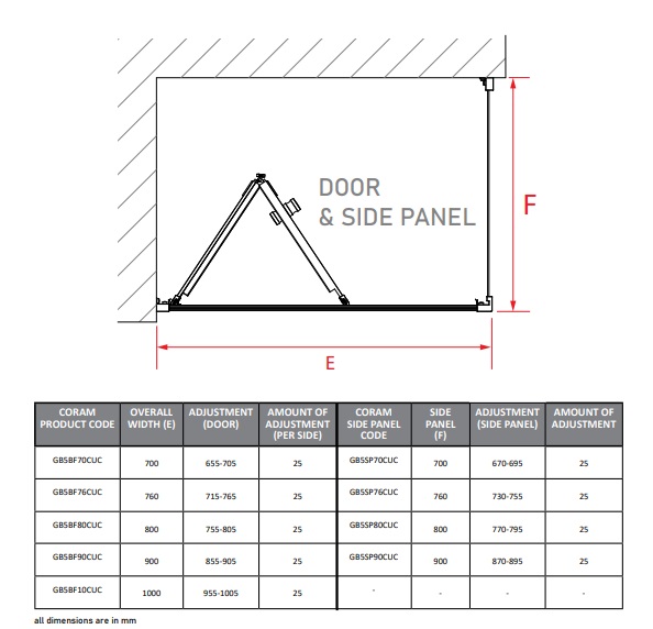 | Description | Designed for locations where space is restricted, with an inward folding door to ensure easy access. 1800mm high, High polished chrome finish, 25mm adjustment per profile, Toughened Safety glass EN 12150, Chrome cover and profile caps, Ultra-clear soft seals, Reversible design, CE tested and compliant to BS EN 14428 |