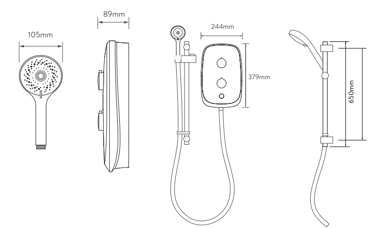 | Description | Digital temperature display and control dial; Satin silver trim; Illuminated push power button and Low water pressure indicator; 3 power settings; Stainless steel hose; Universal multifit: 8 water & electric entry points; 105mm Flow Handset with 3 spray settings, rub clean nozzles and a push button slider; Over temperature protection and phased shut down safety features; Retrofitable |