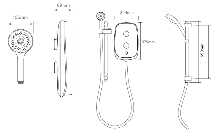 | Description | Digital temperature display and control dial; Satin silver trim; Illuminated push power button and Low water pressure indicator; 3 power settings; Stainless steel hose; Universal multifit: 8 water & electric entry points; 105mm Flow Handset with 3 spray settings, rub clean nozzles and a push button slider; Over temperature protection and phased shut down safety features; Retrofitable |