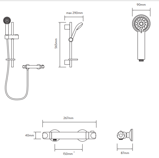 | Description | Slim and stylish, Aqualisa Midas 100 provides quality construction as a compact bar mixer shower. Featuring sleek temperature and flow controls, Midas boasts the added bonus of a temperature override button for added family safety. Combining modern styling with great performance, Midas features a 90mm Harmony shower head with a choice of 4 impressive spray patterns and comes complete with easy clean nozzles. |
