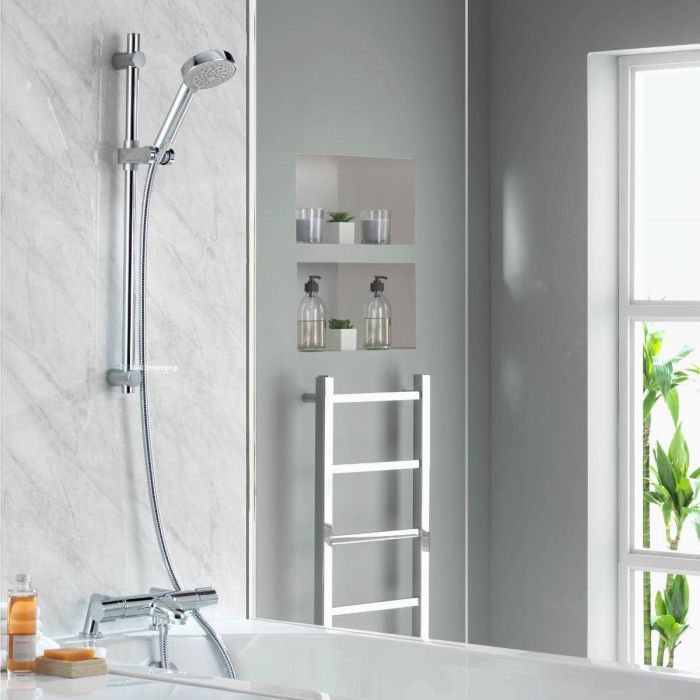 | Description | Stylish looks combined with a modern brass valve makes the Aqualisa Midas 110 the perfect choice for all family bathrooms. Midas is recognised for having a high performance, due in part to the sleek, modern brass valve. Boasting safe touch controls, a temperature override button and integrated diverter for switching easily between outlets, this bath shower mixer is a great solution for family-safe showering. Available in timeless polished Chrome, Midas 110 is available for high pressure and combination boiler water systems. |