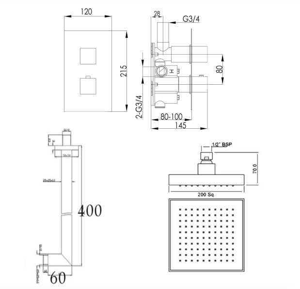 | Description | 86651 – Athena thermostatic concealed 1 outlet shower valve C021003 – Sam square shower arm, 400mm E044015 – Esprite overhead shower 200mm x 200mm, brass Specification