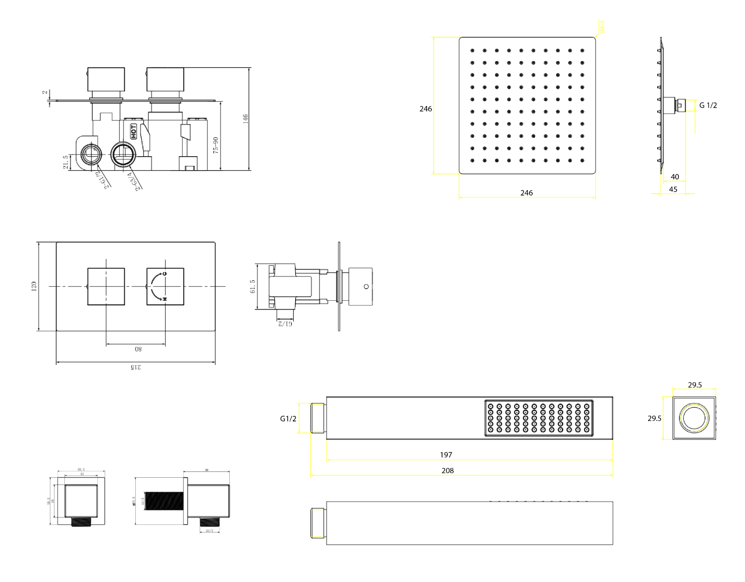 • A thermostatic concealed shower valve, square fixed over head shower arm, shower head, square riser kit with handset holder, outlet elbow & shower handset in Brushed Brass.