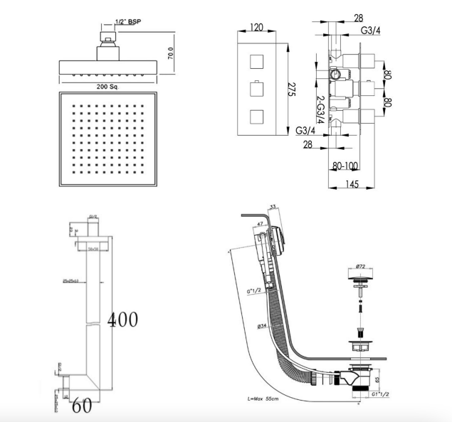 | Description | 86690 – Athena thermostatic concealed 2 outlets shower valve Specification
