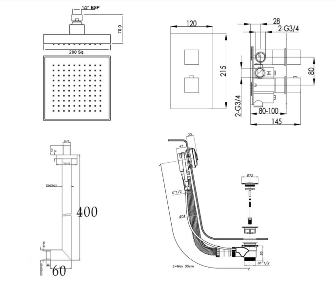 | Description | 86671 – Athena thermostatic concealed 2 outlet shower valve Specification