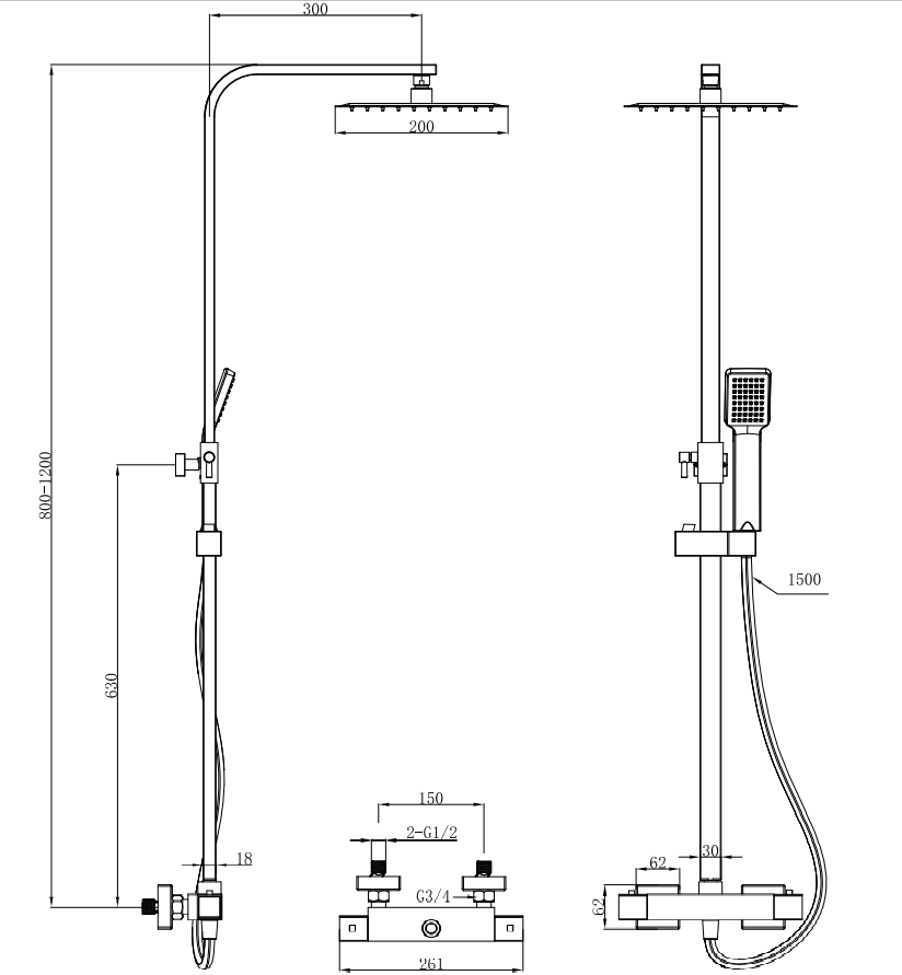 Modern Adjustable Height (850-1200mm) Square Thermostatic Shower Pole - Matt Black