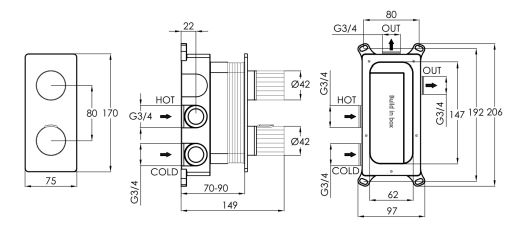 • Modern concealed valve with dual outlet control for overhead and hand showers. Features precise thermostatic temperature control, a brushed brass PVD finish, and durable brass body. Suitable for high-pressure systems (min. 1.0 bar). Dimensions: 215 mm (H) × 120 mm (W).