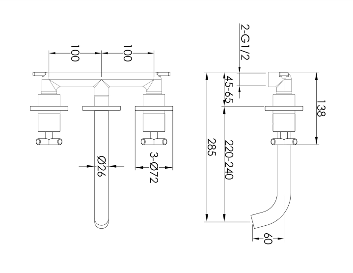 | Description | Specification- Water pressure: MP 0.5, Product Composition: Brass with PVD coating, Guarantee: 15 Years, Solex 3-hole wall-mounted basin mixer, MP 0.5 |