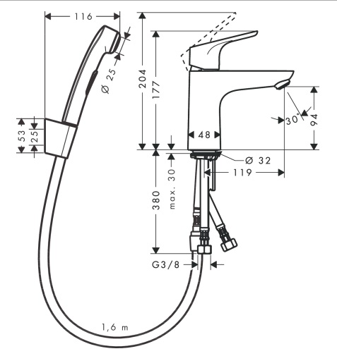 consists of: single lever basin mixer, bidette hand shower, shower holder, shower hose, waste set