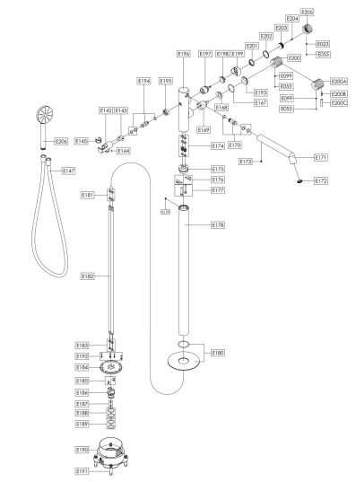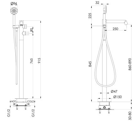 • A modern and minimalist freestanding bath shower mixer, crafted with a sleek no-lever design for contemporary bathrooms. Complete with hand shower and hose, this floor-mounted unit is suitable for high-pressure systems (min. 1.0 bar) and finished in durable, corrosion-resistant PVD coating. Ideal for pairing with freestanding baths.