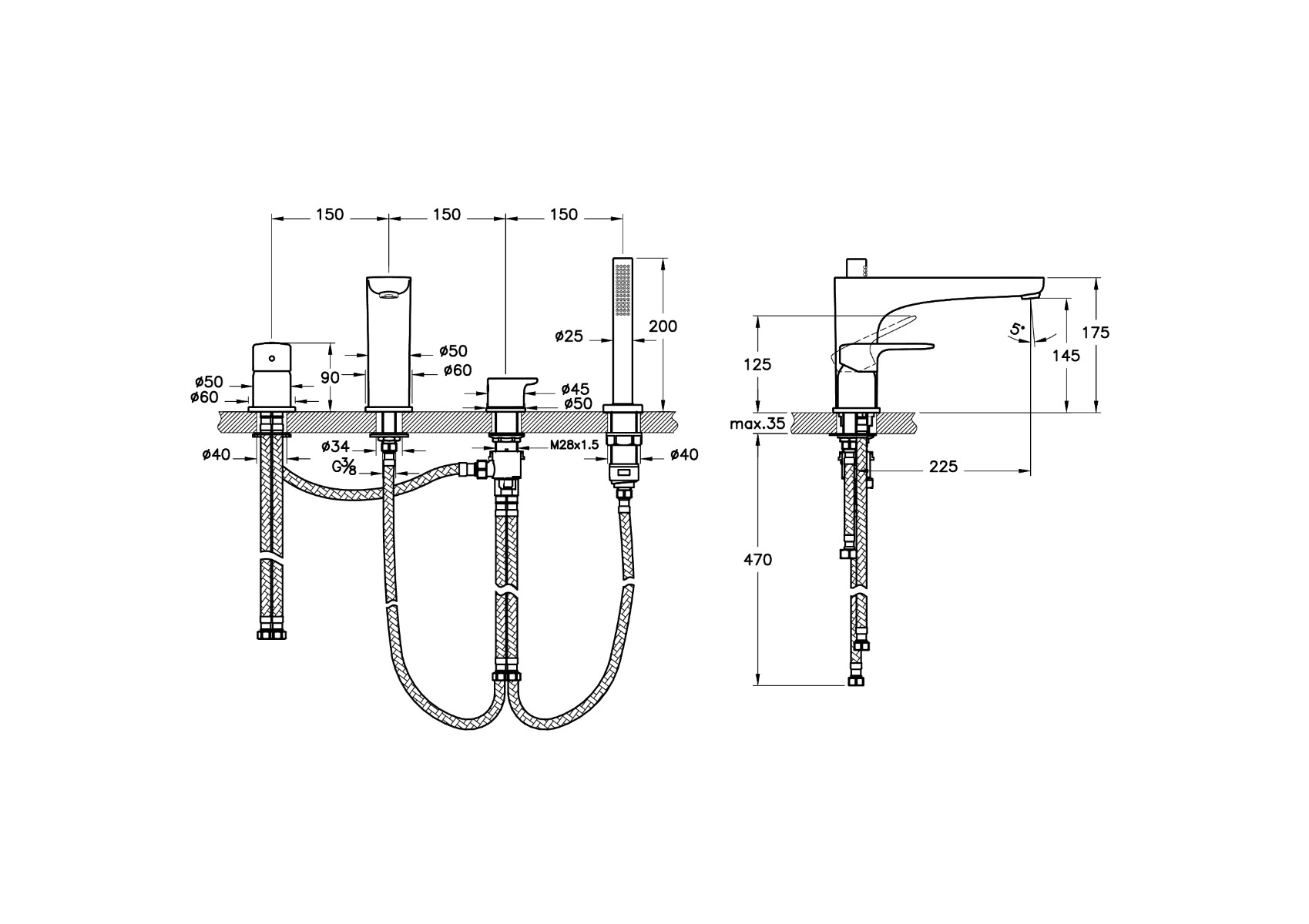 Root Round Bath Mixer Brushed Nickel, Deck-mounted bath mixer, with hand shower, 4 tap hole, round is available to buy in increments of 1
