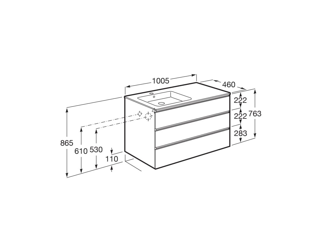 | Description | Base unit / Closing and opening system: Soft close drawers Base unit / Door type: Sliding Base unit / Doors and drawers combination: 3 drawers Base unit / Internal dividers Base unit / Structure: Drawers Basin / Integrated shelf Basin / Shelf position: Left Basin / Taphole configuration: 1 taphole in the middle Basin Position: Left Basin shape: Square Dimensions / Basin and base unit / Height (mm): 763 Dimensions / Basin and base unit / Length (mm): 1005 Dimensions / Basin and base unit / Width (mm): 460 Installation type: Wall-hung, Wall-hung with optional legs Material / Base unit: Chipboard Material / Basin: Vitreous china Tap installation: On the basin Towel rail position: Left |